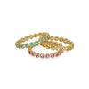 A fun and colourful take on the eternity band. A set of matching Pink Sapphires are set ini our hand pierced yellow gold signature lace